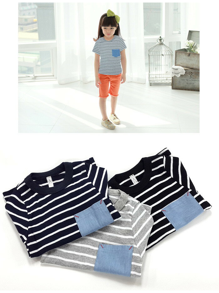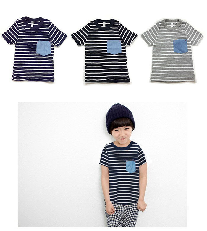 ★夏商品★デニムポケットの3色のボーダーTシャツ・半袖 【子供服 キッズ 韓国子供服 子ども服 子供 CHUMCHUM チャムチャム】【90/100/110/120/130/140/150/160】