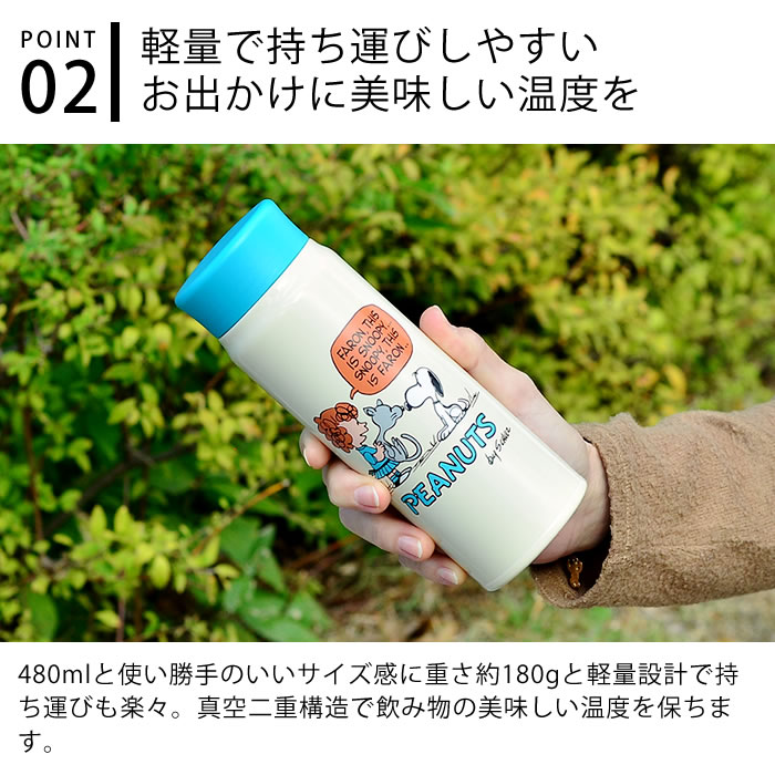 検索キーワード スヌーピー 水筒 ステンレスボトル 480ml スヌーピー グッズ 大人 向け スリム 軽量 ファーロン SNOOPY 保温 保冷 真空断熱 まほうびん かわいい おしゃれ ピーナッツ キャラクター グッズ ステンレス製 ギフト プレゼントスヌーピー ステンレスボトル 480ml世界中で愛されて数十年!ピーナッツのキャラクターを描いた可愛いステンレスボトル世界中で愛されるピーナッツのキャラクター達が描かれたステンレスボトルです。