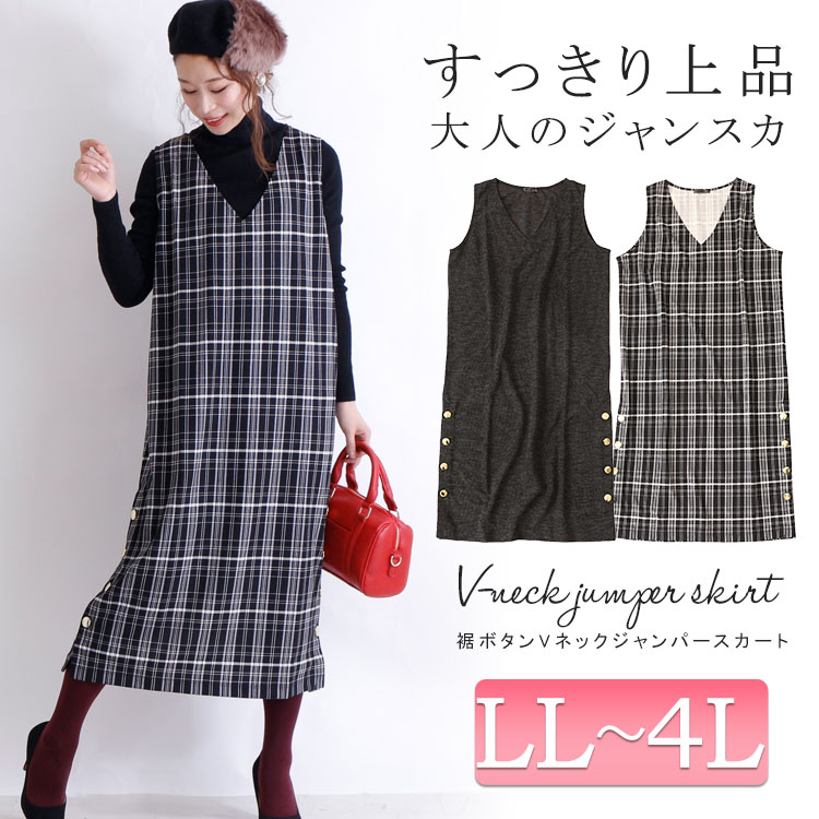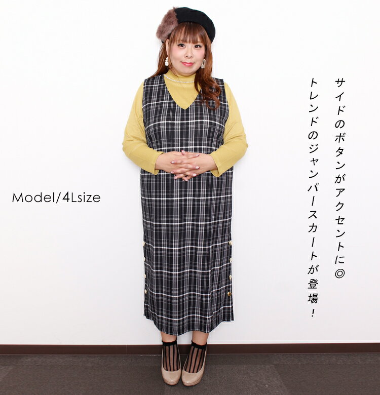 裾ボタン付きジャンパースカート 大きいサイズ レディース ワンピース ワンピ サロペットワンピース サロペ オーバーオール チェックワンピース 金ボタン ミモレ 秋新作 秋 冬 LL LLサイズ 2L 3L 4L XL XXL 13号 15号 17号 ブラック black 黒 チャコール 韓国ファッション