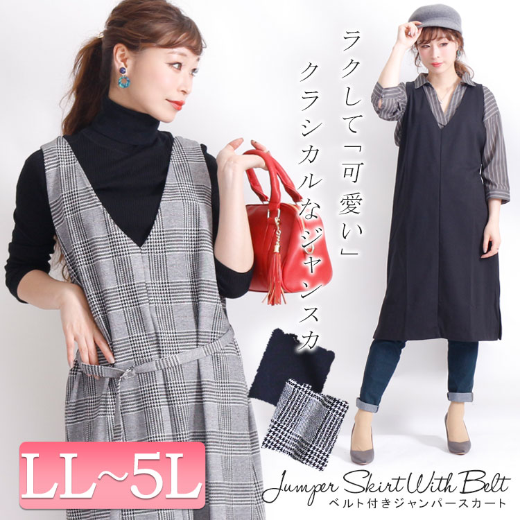 ベルト付きジャンパースカート 大きいサイズ レディース ワンピース ワンピ サロペットワンピース チェックワンピース ノースリーブ 膝丈 スリット グレンチェック ベルト 秋新作 秋 春 冬 LL LLサイズ 2L 3L 4L 5L 13号 15号 17号 19号 ブラック ホワイト 韓国ファッション