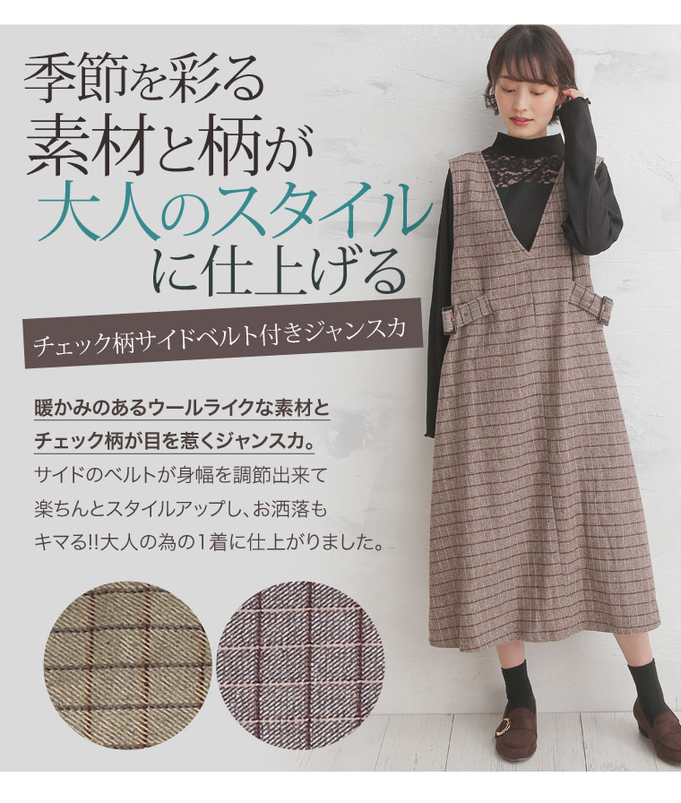 サイドベルト付きチェック柄ジャンスカ すっぽり着られるデザインでストレスフリー◎季節を彩る素材でお洒落に。